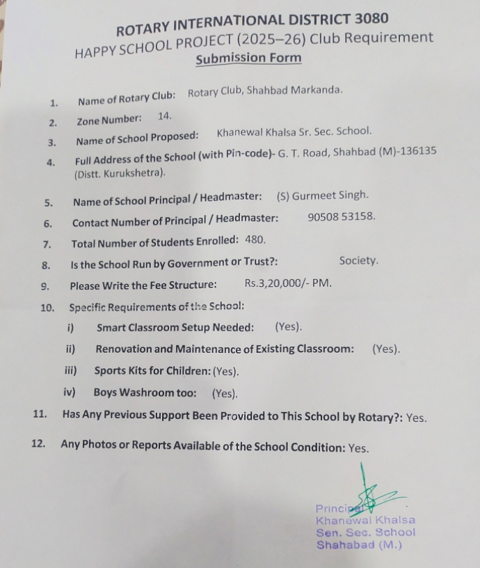 Adopted as a Happy School by Rotary Club Shahabad Markanda formally. . .